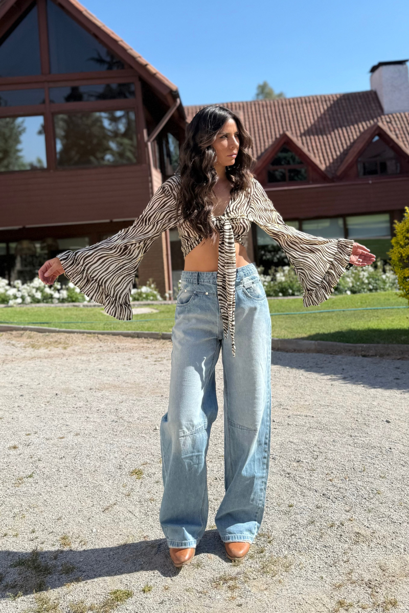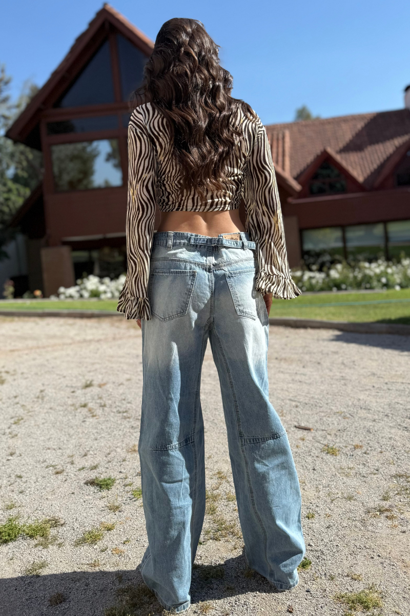 Tiro alto a la cintura, pero también lleva una traba en la parte posterior, que permite regular el ancho de la cintura, así lo puedes usar alto a la cintura o más suelto a la cadera.